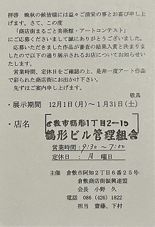 | ぬり絵教室の先生が アート・コンテストへ出品しましょうと いろんな準備をして来て下さいました 「商店街まるごと美術館」の企画アート・コンテストです 先生のお教室の子供さんたちはもう既に仕上げて提出しているとか 直ぐにぬり絵に取り掛かれるように 人物は画用紙にコピーしてくれていたので さっそく色鉛筆で塗り始めます 塗り終わった絵を切り抜き 八つ切りの色画用紙に貼り付けます 白色、鶯色、ピンク色、藍色、えんじ色といろんな画用紙も用意してくれてました その中からえんじ色を選んで 背景の雪は白色のパステルを使い 雰囲気を出しました このコンテストは小学生対象だったのですが 出品作品数が少なくなって 中高生、一般の人も対象者になったらしいです こんなところも少子化の影響でしょうね 12月1日から 商店街の店先に展示されると パンフレットに書いてたけど 全然連絡もないのでほぼ忘れてた~ 「…審査の結果入賞と決まりました…」の通知ハガキが 12月1日に届いた時には やはりうれしくなりました(^O^)/ |